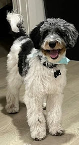 Describes a dog's coat pattern that is 50% or more white with random spotting of a secondary color. Some of our puppies have the TUXEDO PARTI markings, which have a solid torso with white on the neck, chest, and legs, giving them the appearance of wearing a tuxedo.
